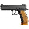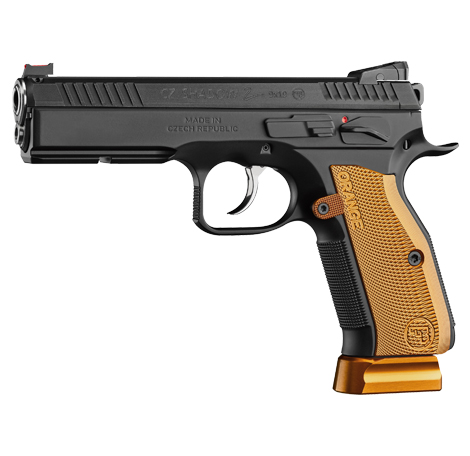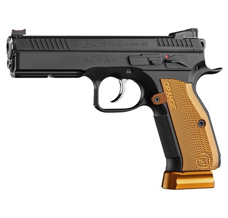 The word Orange in the name of these CZ sport pistols stands for the highest possible quality and absolute top performance. The same is of course true for this model as well. It has been based on the CZ SHADOW 2 pistol which currently occupies the podium in the Production Division at the most prestigious international IPSC events. The ORANGE model, distinguishable at first glance by the new design of its aluminium grip panels in the typical orange colour, has been brought to perfection by tried and tested gunsmithing modifications. The main parts are hand fitted, the trigger mechanism is set for perfectly smooth trigger travel and has a shortened reset. The barrel is polished and to improve the already high accuracy, there is also a barrel bushing. Furthermore, the pistol is equipped with an IPSC hammer and an adjustable aluminium magazine release catch. The magazine has an aluminium base and the enlarged left safety catch provides better grip. A set of flat safeties and a flat slide stop can be purchased additionally.