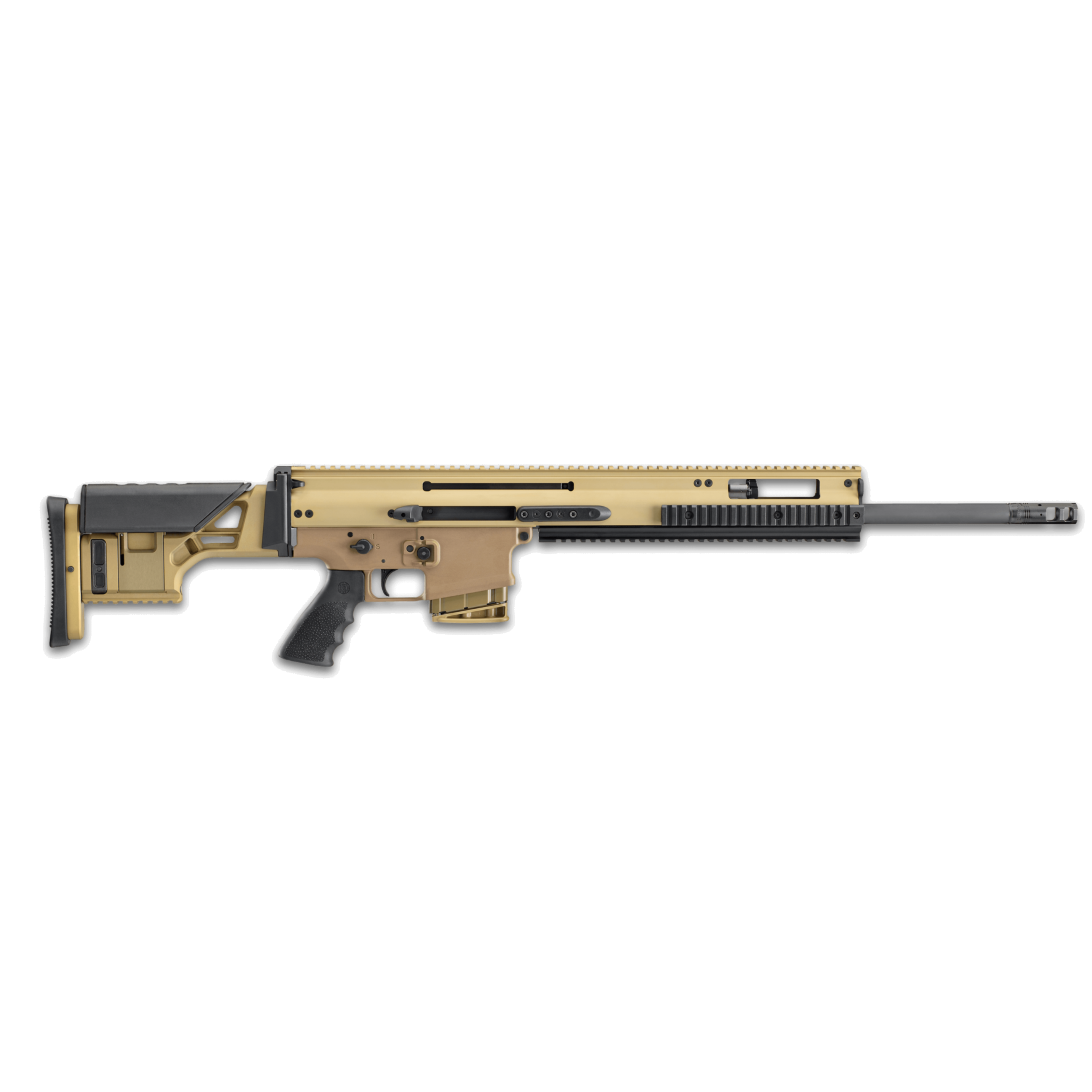 FN America Scar 20S 38-100545 FDE 7.62mm 10RD the perfectly calibrated for long-range precision fire, the FN SCAR® 20S gives you the ability to engage targets up to 1,000 meters. The new, 1:10” twist rate chrome-lined barrel delivers precision accuracy with heavier long range projectiles popular with serious shooters. The gas-operated piston design and Surefire ProComp 762 muzzle device manage recoil efficiently, speeding follow-up shots and maintaining target acquisition. Lending further aid is the Geissele two-stage trigger that breaks crisply at 3.5-4.5 pounds, full-length MIL-STD 1913 rail at 12 o’clock position, and fixed buttstock providing adaptability to fit to each user’s needs through adjustable length of pull and cheek rest height.