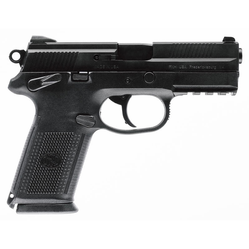 The FNX™ service pistol was introduced in 2009 and incorporates many of the ergonomic improvements initially developed under the U.S. Joint Combat Pistol Program for the FNP™-45 USG. The FNX™ is a double-action/single-action hammer-driven pistol optimized for the 9 mm, .40 S&W and .45 ACP. Its manual safety/decocking levers, slide stop lever and magazine release are all fully ambidextrous for ease of operation with either hand and from any firing position. Both the slide and barrel are stainless steel, and the checkered polymer frame has two interchangeable backstraps with lanyard eyelets. A MIL-STD 1913 mounting rail on the underside accepts tactical lights and lasers.