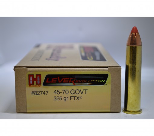 Hornady 45-70 Government 325gr FTX LEVERevolution is the most exciting thing to ever happen to lever gun ammunition. Hornady, the leader in ballistic technology, brings you an innovation in ammunition performance featuring state of the industry patented, FTX (Flex Tip eXpanding) and MonoFlex bullets that are SAFE in your tubular magazine. Its higher ballistic coefficient delivers dramatically flatter trajectories for fantastic downrange energy increases and amazing bullet expansion at all ranges. It truly is an evolution in lever gun ammunition!