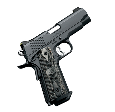 The Kimber Pro Tactical II is the bridge between concealed carry civilians to tactical response professionals. With all the performance enhancing features demanded by law enforcement but in a smaller package. The Pro Tactical II has 3-dot tritium night sights that glow in all conditions, giving the operator a tactical advantage in low light settings. The compact lightweight aluminum frame is easier to carry, reducing user fatigue over time. The Kimber Pro Tactical II features an extended ambidextrous thumb safety as well 30 Line-per-inch front strap checkering to ensure a positive grip on the firearm at all times. The Tactical II also uses a extended and beveled magazine well to aid in faster, more positive, reloads. Finished a sleek charcoal grey, and laminate double diamond grips. The Kimber Pro II uses a full length guide rod. Be sure to check out Kimber America for more information!
