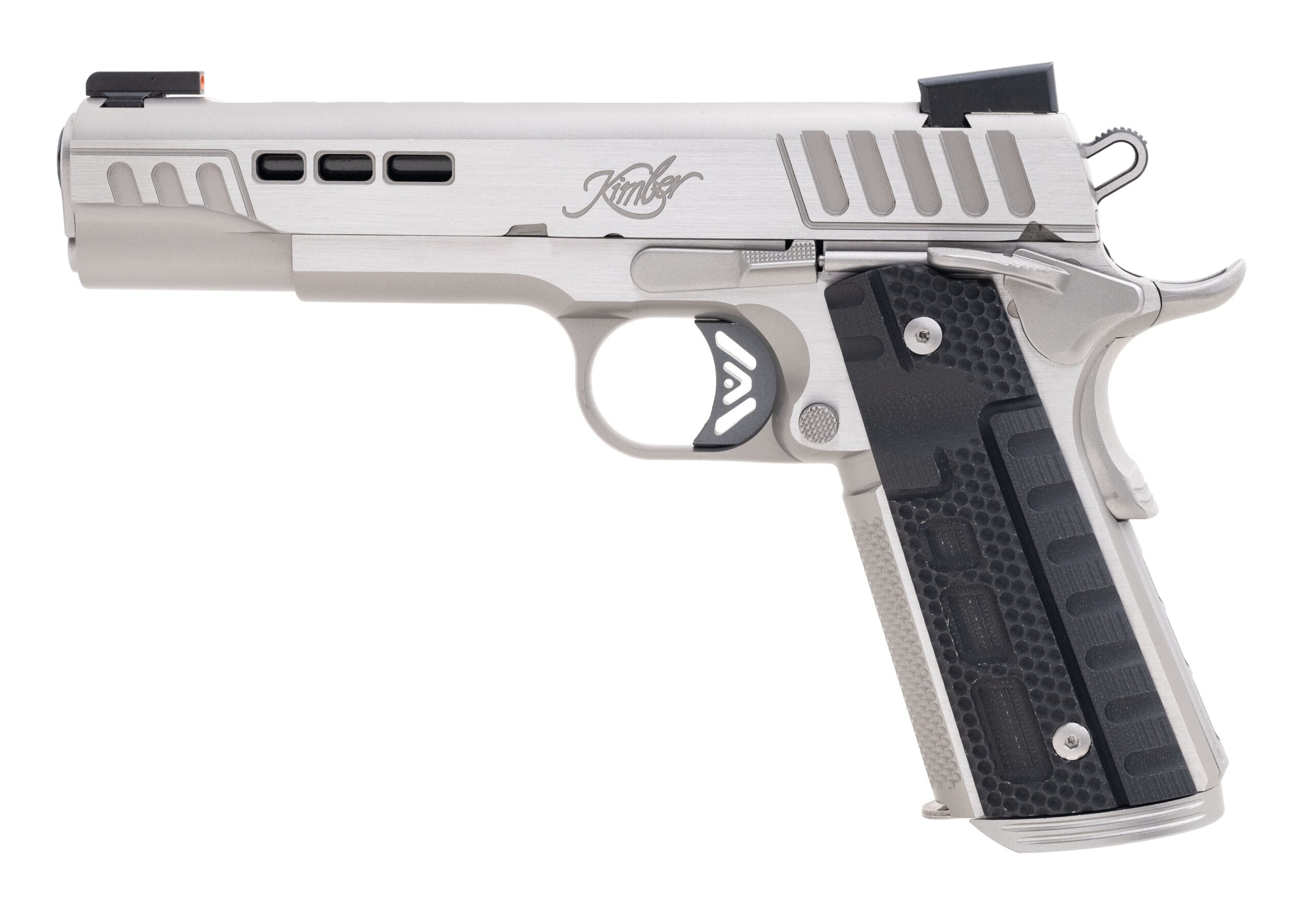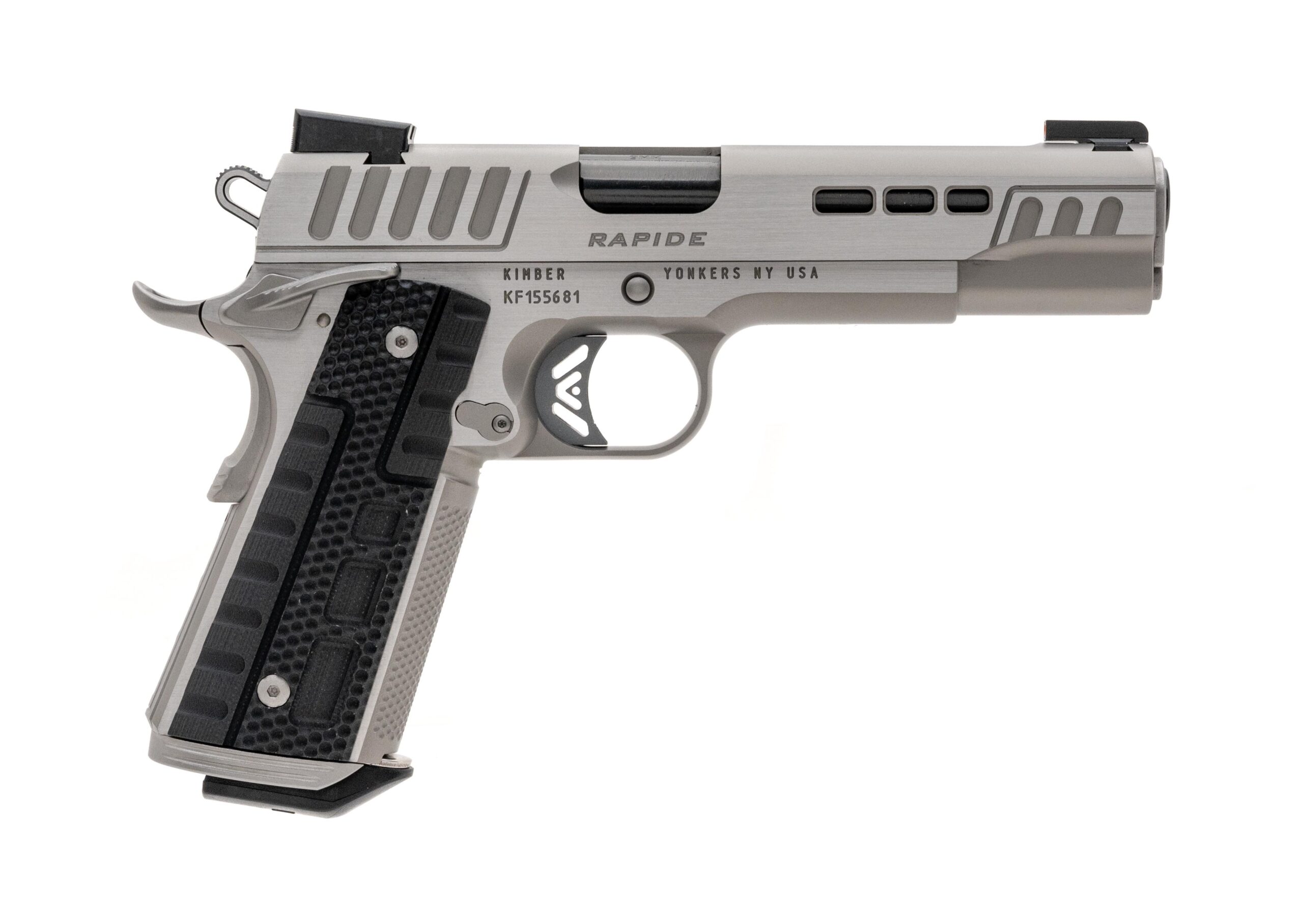 The RAPIDE (Frost) (DN,NS). A truly unique 1911 with stepped cocking serrations, slide lightening cuts for faster Slide lock-up and DLC coated barrel for extreme durability. Equipped with Kimber Stiplex TM front strap stippling and Black G10 Rapide patterned grips for extra griping confidence. Kimpro Silver finish with brush polished flats finish off the stunning looks.