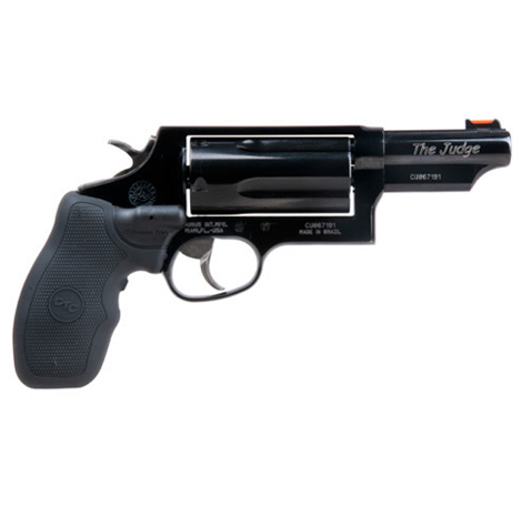 The Taurus Blue 45-410 Judge 3 is excellent for short distances. This model, Taurus Judge 4510, holds 5 rounds and is chambered in .45 Long Colt (also accepts .410 bore). Weighing 34.3 oz unloaded, the Taurus 4510 is built with a compact steel frame, black rubber grip, and a blued finish. Additional features of the Judge 4510 Blued include a fiber optic front sight and extended ejector rod. The Judge 4510 Blued, 5 Round Revolver, .45 LC/.410 Ga has a transfer bar safety.