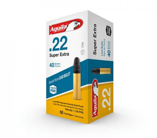 Aguila 22LR Standard Velocity 40Gr Lead Round Nose, 50 Rounds. Aguila “Super Extra” standard velocity is a tin can’s worst enemy. The Standard Velocity Aguila round is the perfect plinker round for any occasion. Consistent performance, at an affordable price. The lead round nose bullet weighs 2.59 grams or 40Gr. Muzzle velocity is 1130 feet per second, and at 100 yards it will be at 981 ft/sec. Muzzle energy is measured at 113 ft/lbs and decreases at 100 yards to 86 ft/lbs. One of the best standard velocity bullets in its class, comparable to CCI or Federal. Comes in a 50 round box. Manufactured in Mexico.