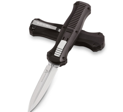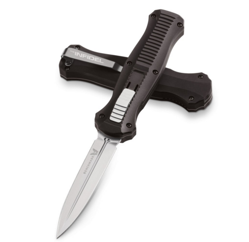 Benchmade 3300BK Infidel Automatic OTF Knife: Introducing an OTF like none-other. The Infidel¨ is rapidly making believers out of many a skeptic. Built for strength and reliability the patent pending double-action mechanics get it done over the long haul. Grab on and you will find the handle grip rock-solid with its patented machined in Presidio¨ style bi-directional tread pattern, and overall generous sizing for gloved hands. Intuitively pressure the release-slide forward and its spear-point edged steel fires and locks up with a unique three-point retention system with amazingly negligible blade play. Reverse the process and the blade retracts in a rapid blur of motion. The Benchmade Infidel is a special operatorÕs fantasy come true. In addition to the incredibly stable, fast action and the rugged, pure tactical nature of the knife, the Infidel has a cool factor that is hard to describe without physically experiencing it. MOLLE¨ compatible.