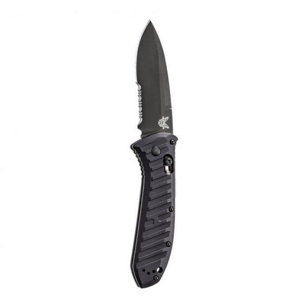 Benchmade 5700SBK Auto Presidio II Automatic Knife. This automatic Presidio II model sports a black aluminum handle and a black finished blade with a partially serrated edge. Benchmade has updated their legendary Presidio model with significant ergonomic and performance upgrades. This combat legend has a black anodized 6061-T4 billet aluminum handle with Benchmade’s AXIS lock system for effortless one-handed opening and closing. Milled grooves in the handle improve grip while adding a modern flair to the design. The Presidio II has a slightly larger blade and handle that is built to perform well as a tactical or everyday carry knife. Item includes a Cordura sheath with snap retention and a Malice Clip.