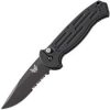 Benchmade 9051SBK AFO II Automatic Knife. The AFO II 9051SBK has a BK1 black finished drop point style blade with a partially serrated edge. The handle is black anodized aluminum with a fully reversible pocket clip. Includes a ballistic nylon sheath with Malice clip.