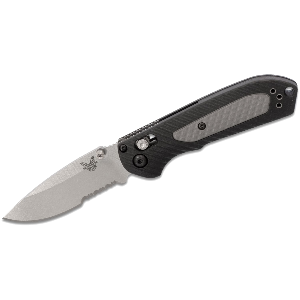 Benchmade Mini Freek 565S AXIS Folding Knife. The Benchmade 565S Mini Freek is a compact everyday carry knife made to tackle cutting tasks of all sorts, whether indoors or out. It features a premium CPM-S30V stainless steel blade with a satin finish and a partially serrated cutting edge. The Mini Freek’s warm gray Grivory and black overmolded Versaflex handle provides excellent grip security during use with its deep grooved texturing.