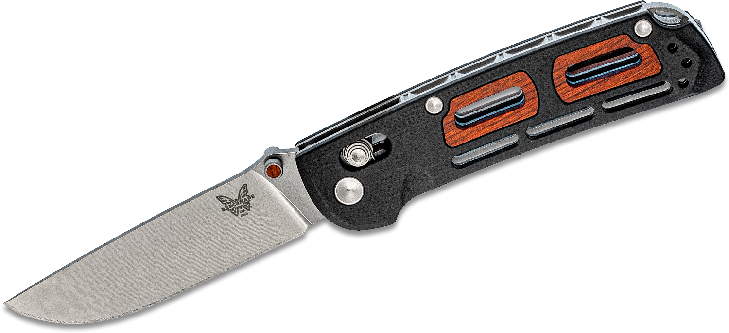 The Benchmade 486 Saibu (Japanese for “details”) is a collaboration with Seiichi Nakamura that reflects the word in its intricate design. Its black G-10 handle is outfitted with Cocobolo wood window accents, a custom bamboo-styled metal backspacer, and the dependable AXIS lock mechanism. The Saibu sports a satin finished drop point blade made from premium CPM-20CV steel with Cocobolo accented thumb studs. This exceptional folder is worthy of the most discerning knife collectors and enthusiasts.