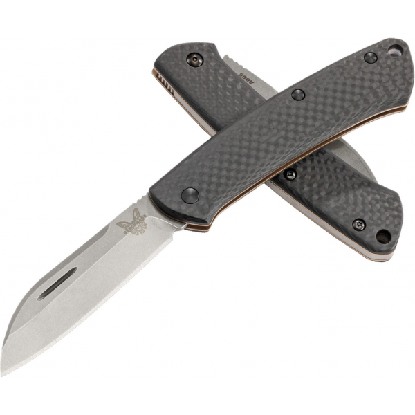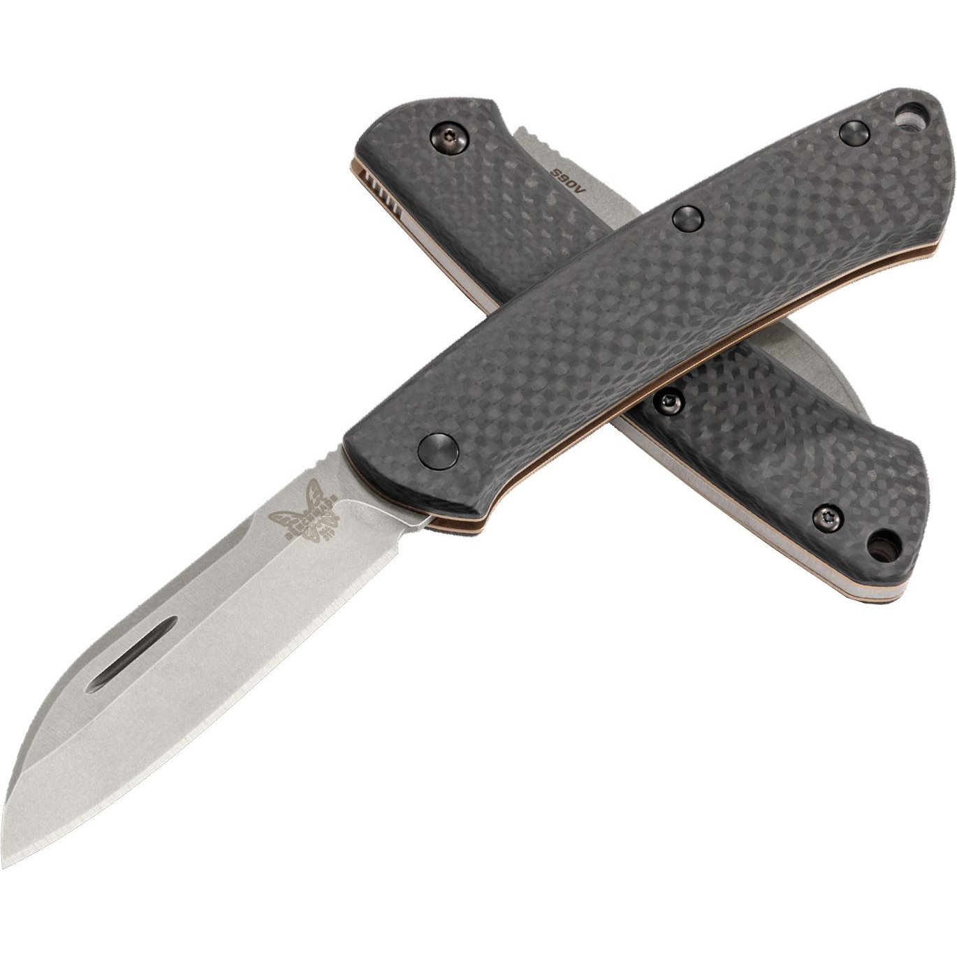 Benchmade Proper 319-2 Slipjoint Folding Knife.  This Proper model features contoured carbon fiber scales paired with a stonewash finished sheepsfoot blade made from premium CPM-S90V stainless steel. The Benchmade Proper slip joint folder is a modern take on a classic gentleman’s knife design. Skeletonized stainless steel liners with a flat dark earth PVD coating offer reduced weight for comfortable everyday carry in a pocket or pack. A lanyard hole in the handle accommodates key ring or lanyard attachment.