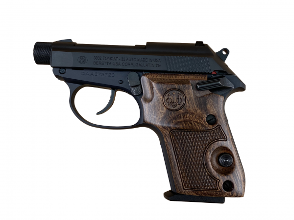 Beretta 3032 Tomcat Covert J320125 32ACP 7RD with a tip-up barrel design that allows the user to load the chamber without slide retraction. The Covert model includes a factory threaded barrel with a thread cap, a Bruniton finished slide and barrel along with high-grade walnut grips, recessed magazine release and fixed low-profile sights.