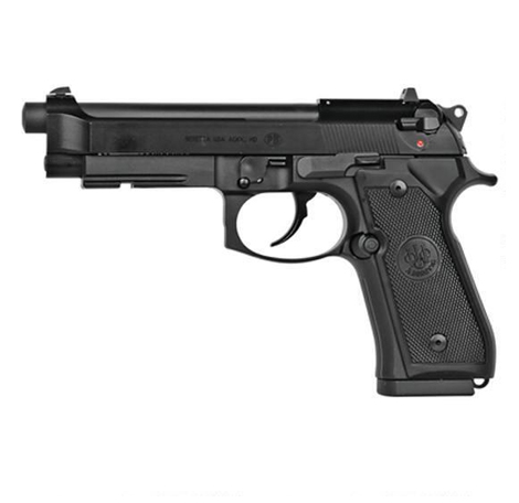 The .22 caliber Beretta M9A1 is a replica of the original 9mm A1 model, with the same controls, operation, takedown and under barrel rail. This is a double action/single action semi automatic with an open slide design and military style markings.