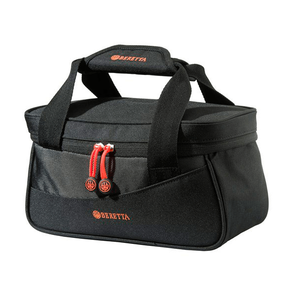 The Beretta Uniform Pro Black Edition Bag for 100 Cartridges has the capacity for 4 cartridge boxes. The bag will hold 4 boxes of shells along with other essentials for the range. It has an external pocket and a zippered internal pocket. The double handles with a velcro closure offer easy carry, or use the included padded adjustable shoulder strap.