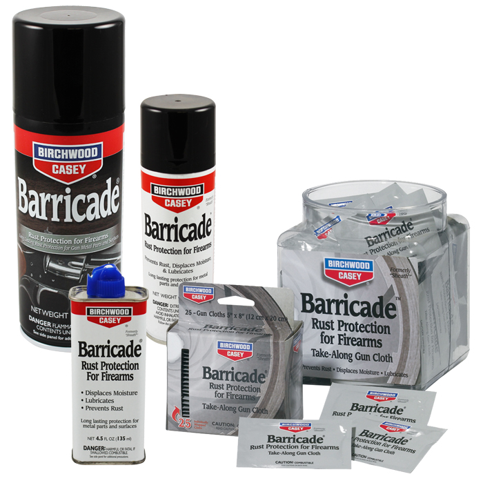 Birchwood Casey Barricade Rust Protection 10 Ounce Aerosol – Barricade Rust Protection for firearms rapidly drives out moisture from firearm metal pores and deposits a transparent protective coating which seals the surface. It’s the best way to protect your firearms from rust. Withstands 500 hours in ASTM humidity test and 96 hours in ASTM salt spray test. Barricade Rust Protection for firearms is also an excellent penetrant for loosening rusty or frozen parts, as well as a good lubricant. Take your pick of how you’d like to protect your firearms – with a variety of can options or Take-Along Gun Cloths! It’s never been easier.