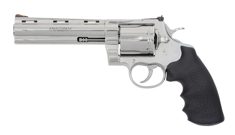 The Anaconda has been fully re-designed to utilize an oversized Python action. Bulked-up with a solid stainless steel frame for strength and durability, this revolver is worthy of its pedigree. Experience the Linear Leaf Spring Action for a non-stacking, smooth-as-glass trigger pull. With recoil-absorbing Hogue grips and adjustable, interchangeable sights, this .44 Magnum is cool and comfortable from the range to the woods. A recessed target crown offers protection and the frame is drilled and tapped for optics mounts, making the Anaconda an unstoppable huntsman’s sidearm.