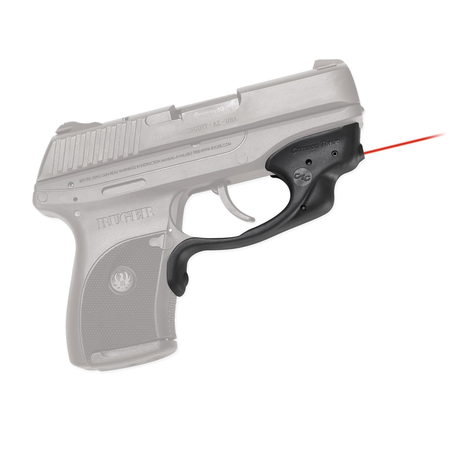 The Crimson Trace LG-412 Laserguard is specifically designed to fit Ruger LC9 and LC380 compact concealed carry pistols. The laser sight is quickly user-installed in minutes, attaching securely to the trigger guard. Pre-zeroed from the factory at 50′, the LG-412 is fully adjustable for windage and elevation with included wrenches, allowing the user to fine tune the laser sight to their perference. Proudly made in the USA, the LG-412 Laserguard includes a front activation button and features Instinctive Activation, which means that the laser is activated automatically when the gun is held in a natural firing grip.