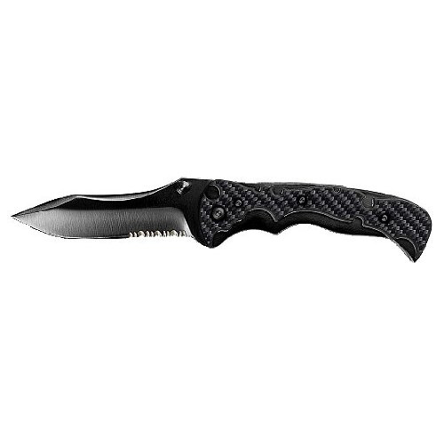 CRKT 1091K My Tighe Assisted Folding Knife: Canadian knifemaker Brian Tighe is a true Renaissance Man, with an array of professional skills including tool and die making, metallurgy, engraving and photography. In his St. Catharines, Ontario, workshop, he produces a wide array of custom folders, all with those signature touches that immediately make them stand out as Brian Tighe knives. CRKT have carefully translated Brian’s popular My Tighe custom frame lock folder into an affordable production line. At first glance, the knife seems like a design exercise until you grasp it and understand that the concave cut scales are craftily shaped to enhance grip, aggressive with contours in just the right places. Brian’s blade design is unique too, with its asymmetrical spine facets, high-hollow grind and deep belly with recurve. CRKT uses 1.4116 stainless steel in a high satin finish with the exclusive Combination Razor-Sharp and patented Veff Serrated edges. Designed by knifemaker Tom Veff, these unique scalloped and angled serrations cut through rope and cord smoothly without snagging. On the “K” model, the blade is coated with black non-reflective titanium nitride for maximum corrosion resistance and the frames are black EDP plated. The result is a non-reflective tactical look. The frame lock folder has an open build with heavy-duty 420J2 stainless steel frames and a 6061 T6 aluminum back spacer. The injection-molded black glass filled nylon scales have a carbon fiber texture. Torx fasteners are used throughout. The patented OutBurst assisted opening mechanism instantly springs the blade fully open after you have opened the blade approximately 30¡. There are bronze and lubrous washers at the adjustable blade pivot for fast action. Dual ramped thumb studs allow the My Tighe to be quickly opened with either hand. The knife features a removable black stainless steel pocket/gear clip. It’s hard to ignore any Brian Tighe design, especially these highly personal work knives. Carry one and you will certainly start a conversation among knife fanciers everywhere. The knife industry was so impressed at the BLADE Show in Atlanta, Georgia, it was named the 2006 Imported Knife of the Year.
