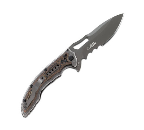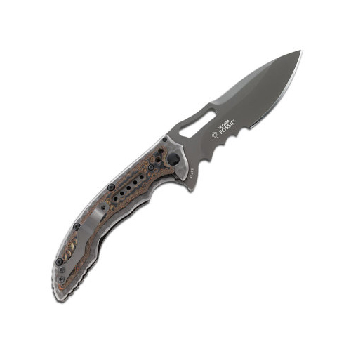 CRKT 5471K Fossil Folding Knife: Makes all your other stylish knives extinct. Flavio Ikoma’s latest folding knife looks like a T-rex on stainless steel steroids. The Fossilª is one part hard core, one part gorgeous and one part 12,000 pound flesh-eating dinosaur. The Fossilª combines the best from designer Flavio Ikoma. With styling cues found on his previous Sampaª and Carajasª models, the Fossilª ramps up the artistic flair to create a piece that is clearly Ikoma, yet distinctively a new breed of EDC folder. The pocket knife features an IKBS ball bearing system, combined with an opening flipper for silky smooth blade deployment. The flipper turns into a handsome finger guard when the blade is open. A thumb hole cutout in the blade gives you a second option for opening the knife. This model of the Fossilª has a non-reflective, gray EDP coating that adds durability to the blade. Veff Serrationsª make quick work of rope, webbing and other fibrous materials. The handles of the Fossilª are stainless steel with a unique hammer finish. The knife locks open solidly with a frame lock. Duo-tone G10 scales add contour and grip to the handle. The pocket clip is tip-up carry only. The Fossilª has the beauty of a museum piece combined with the shear muscle of a prehistoric carnivore.