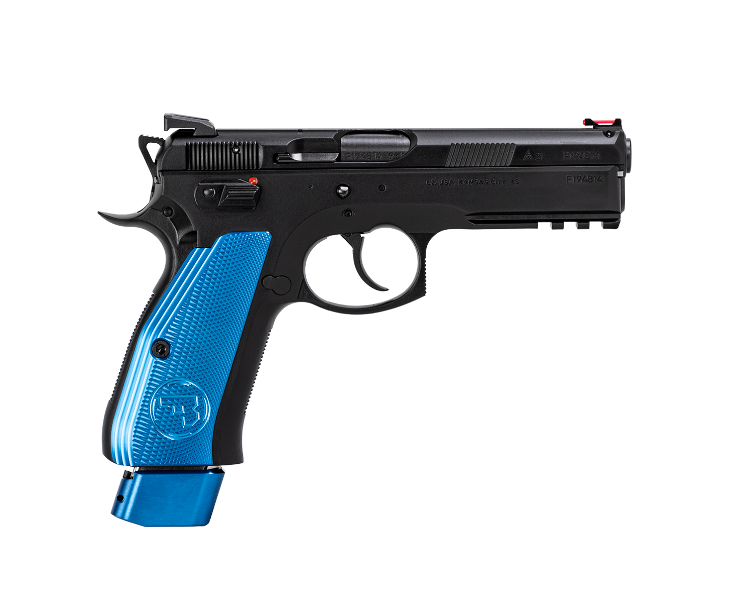 CZ’s SP-01 Competition Blue Pistols were built on a proven lineage, adding match-ready upgrades and race-gun features that competition shooters want. This high performance pistol excels on the range and equally well at home as a defense weapon. The competition model inherits its build quality from its parent model, the SP-01, with upgraded features like aluminum grips and extended aluminum base pads for an impressive 21+1 mag capacity. The pistol includes a competition hammer which gives the pistol an exceptionally crisp, light trigger pull of less than 7. 5-pounds double action and 3. 5-pounds single action. Thanks to the lightened hammer spring, the pistol feels lively and remarkably responsive in the hand. Additionally, the SP-01 Competition Blue uses a lighter recoil spring for running target loads.