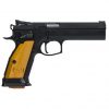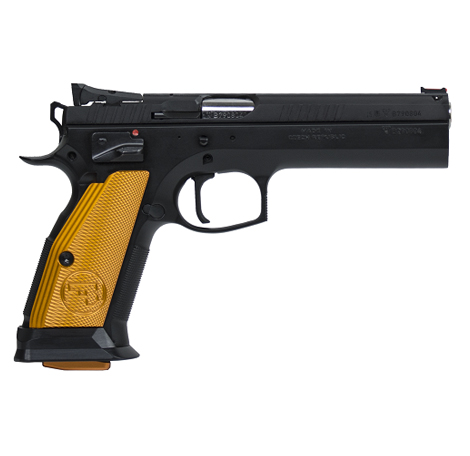 Turning the Tactical Sport up a notch. The CZ 75 Tactical Sport Orange 40 S&W borrows a number of design features from the Czechmate. Likewise, incorporates a few of its own. Firstly, with the slimmer trigger guard, revised grip geometry, and finer checkering from the Czechmate frame. Secondly, it adds a thumb stop and fully-adjustable target sights.