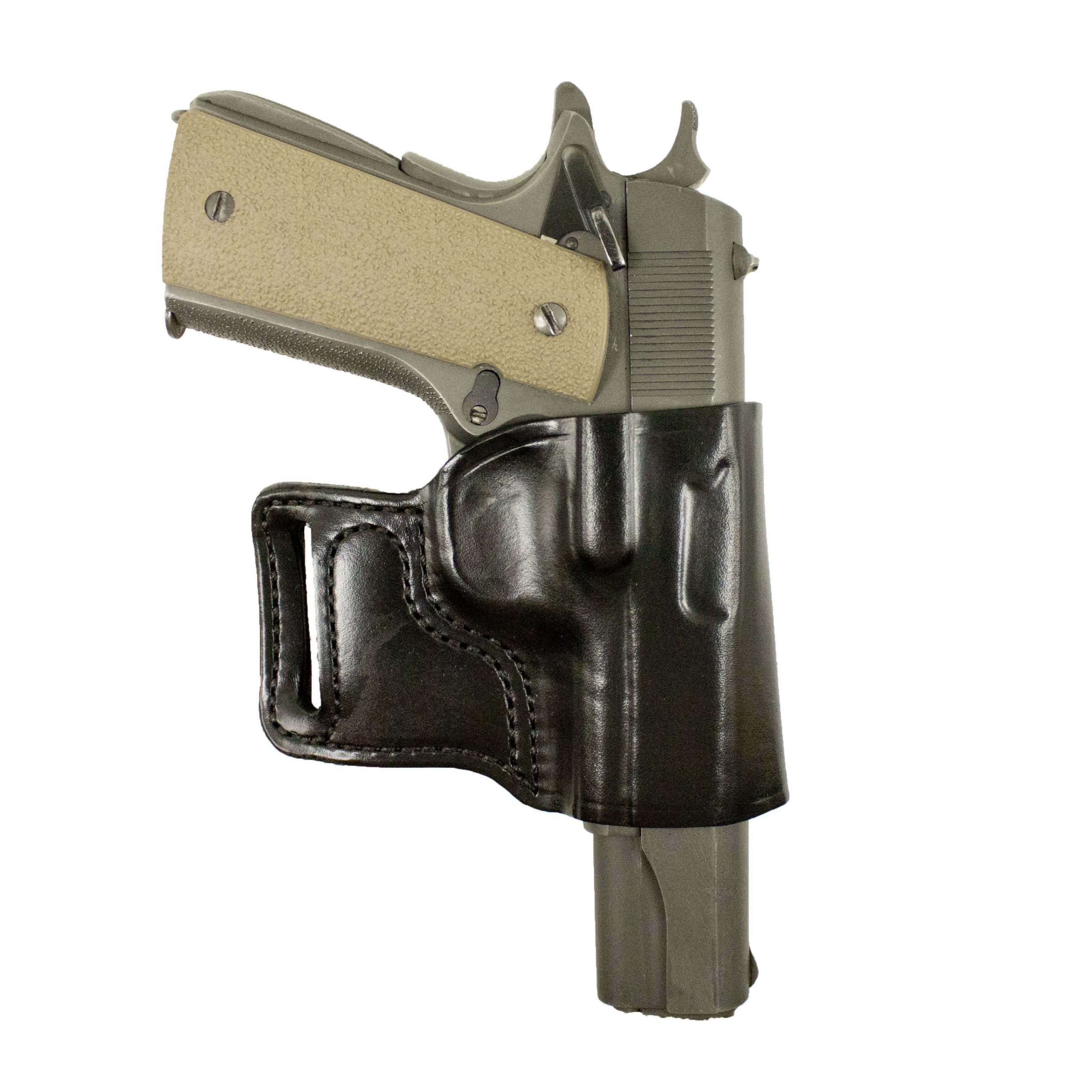 Desantis E-GAT Slide Holster – Right, Black 115BA85Z0 – 1911 3.5″/4″/5″ – The DeSantis E-GAT Slide Holster is a basic neutral concealment OWB holster that works equally well on the strong side or cross draw. This DeSantis E-GAT Slide Belt Holster works with both revolvers and autos and is available in a black-finished top grain leather. The DeSantis E-GAT Slide Grain Leather Belt Holster has been simplified in the production process to save you quite a few bucks, without costing you anything in performance.