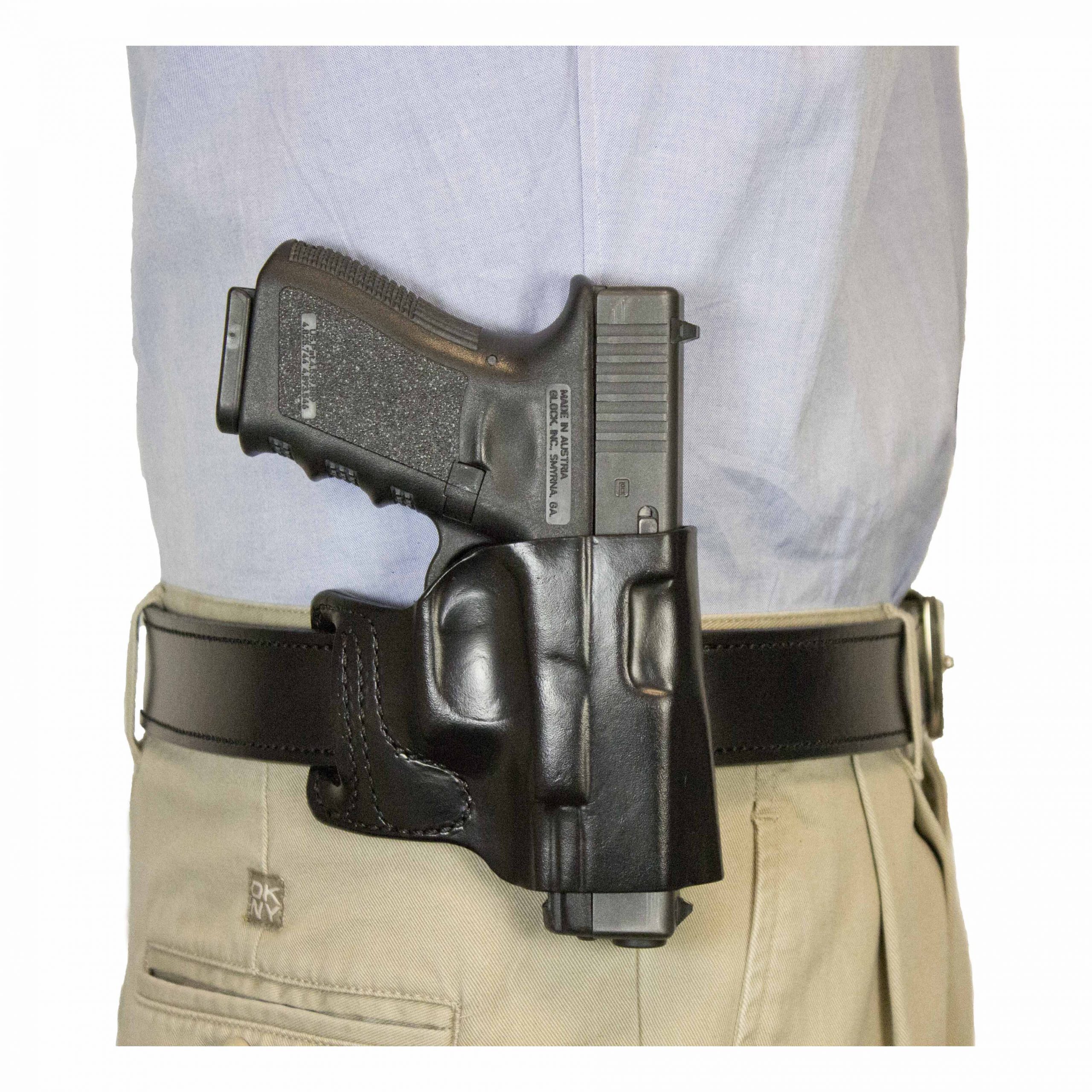 Desantis E-GAT Slide Holster – Right, Black 115BAB2Z0 – Glock 17,19,22,23,26,27 – The DeSantis E-GAT Slide Holster is a basic neutral concealment OWB holster that works equally well on the strong side or cross draw. This DeSantis E-GAT Slide Belt Holster works with both revolvers and autos and is available in a black-finished top grain leather. The DeSantis E-GAT Slide Grain Leather Belt Holster has been simplified in the production process to save you quite a few bucks, without costing you anything in performance.