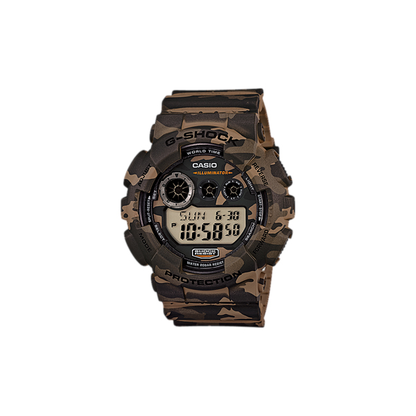 The woodland camouflage pattern of the G-Shock Classic GD120CM-5, Camo make these watches perfectly suited to today’s street fashion scene. A new multi-angle printing technology was applied to create the case and band patterns of these models, as well as the camouflage patterns of their dials. GD120CM-5 is a digital watch with brown and green camouflage pattern.