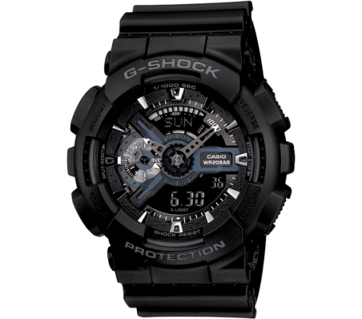 G-Shock is a line of watches manufactured by Casio, designed to resist mechanical shock and vibration. Its full form is Gravitational Shock. Shock Resistant. Adding metal elements and a stealth black coloring to the already popular G-Shock Military GA110-1B, one can bet on this model becoming a huge success. Black resin band analog and digital watch with a black face.