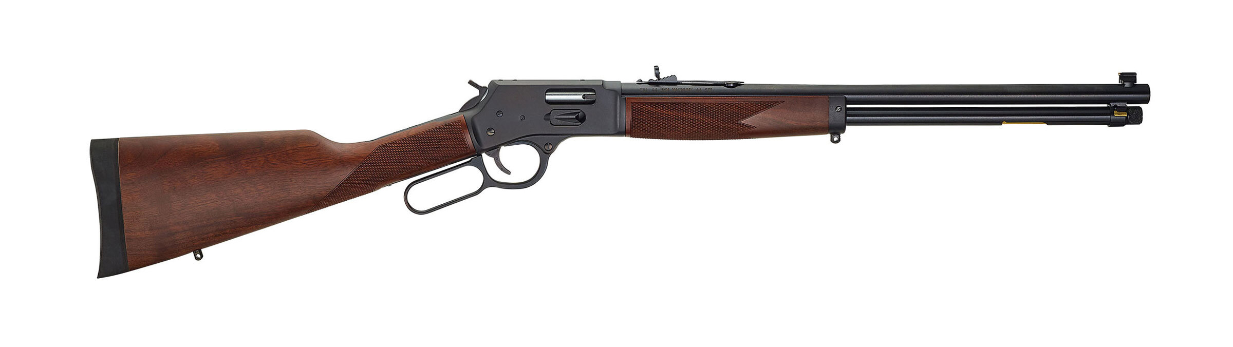 Henry Big Boy Steel Side Gate Blued/Walnut Lever Action Rifle – 44 Magnum – 20in – Traditional in appearance, pistol-caliber Big Boys are drilled and tapped for optic mounts for rapid target acquisition with red dots and longer reach with magnified scopes. Long barrels produce a substantial velocity increase with Magnum pistol cartridges, approaching the conventional rifle levels while offering greater tube magazine capacity and shorter lever throws thanks to shorter cases. Smooth, dependable actions and inherent accuracy of Henry barrels add up to enjoyable handling and effective performance on game and paper targets alike.