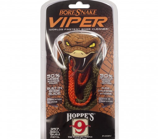 Hoppe’s Viper Boresnake Bore Cleaner Pistol .357, 9mm, .380, .38 Caliber – Hoppe’s Bore Snake Viper takes the world’s fastest gun bore cleaner and makes it even better. The Bore Snake Viper utilizes the same one-pass pull-through technology and compact storage size of the original Bore Snake with the addition of an extra cleaning brush for a total of three, providing 50 % more cleaning power. The Bore Snake Viper has a cone shaped bore guide on the leading end to allow for easy insertion into your gun’s bore. The pull cord on the Bore Snake Viper is attached directly to the brushes for superior strength. The area to apply lubricant on the Bore Snake is clearly marked in bright orange.