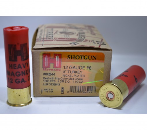 Hornady Heavy Magnum Turkey ammunition is loaded with 1½ ounces of either #4, #5 or #6 nickel plated lead shot. These 3 inch 12 gauge shotshell loads deliver true “gobbler” knockdown power! Offering the thickest nickel-plating in the industry, shot deformation is minimized, thus reducing fliers and keeping more pellets on target for dense patterns.