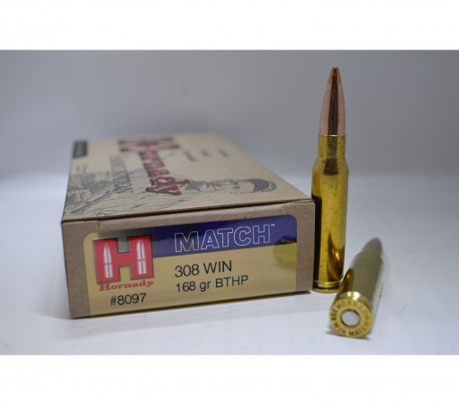 Hornady 308 WIN 168 gr match rifle ammunition is loaded with the most accurate, consistent match bullets in the world: our sophisticated boattail hollow point match bullets and our technologically advanced A-MAX Match bullets.