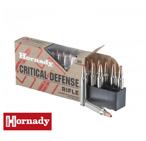 Nickel-plated cases resist corrosion and optimized propellants burn quickly to reduce recoil and limit muzzle flash, making Critical Defense® dependable in every situation. Hornady rifle ammunition is loaded with the most accurate, consistent bullets in the world. 20 cartridges per box.