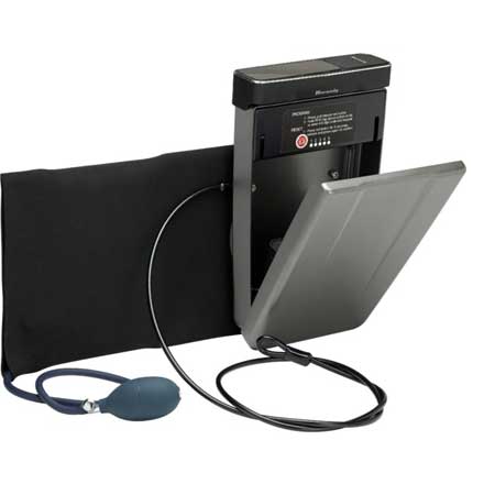 The patent-pending mounting system of the RAPiD® Vehicle Safe features an inflatable bladder that conforms to a vehicle interior’s shape, making modifcations to the vehicle unnecessary. Power is supplied by the included 12-volt car adapter or four AAA batteries(not included).