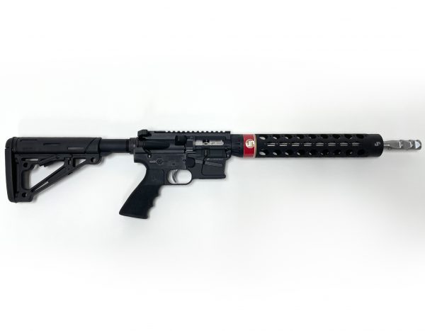 This rifle has a 14.5″ Barrel with a pin/weld polished stainless muzzle compensator giving it a total length of 16″.