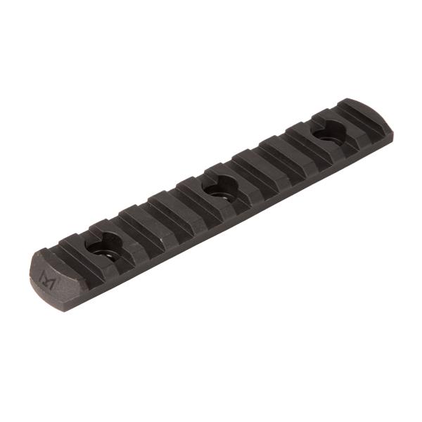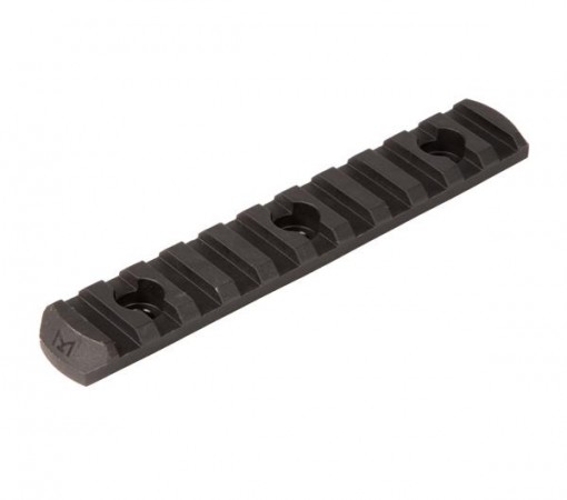 Magpul M-LOK Polymer Rail 11 Slots – Designed for use with all M-LOK compatible Hand Guards and Forends, Magpul M-LOK™ Polymer Rail 11 Slots Sections provide a cost effective method of attaching various 1913 Picatinny spec rail-mounted accessories such as lights, vertical grips, etc. Injection molded from a proprietary reinforced composite for enhanced strength and durability while remaining lightweight, Rail Sections also feature beveled ends to reduce snagging and eliminate sharp corners and edges. All hardware necessary for attachment directly to M-LOK Slots on either aluminum or polymer hand guards and forends is included. 11 Slots, max overall length of 4.9 in.