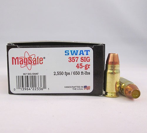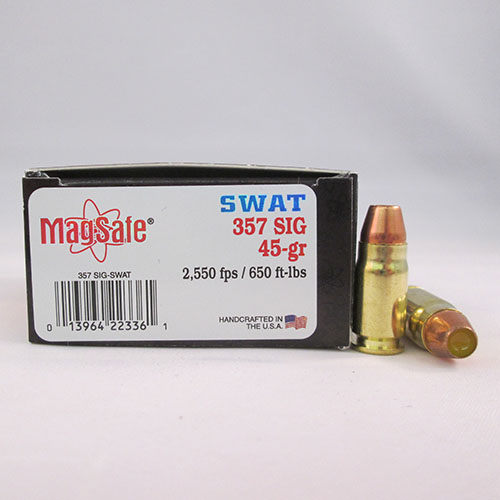 The world’s most effective handgun ammunition, MagSafe .357 SIG 45gr SWAT offers magnum performance with safety. MagSafe’s revolutionary design uses large lead shotgun pellets rather than solid lead for a bullet’s core. There isn’t another bullet anywhere with the take-charge performance offered by MagSafe .357 SIG 45gr SWAT.