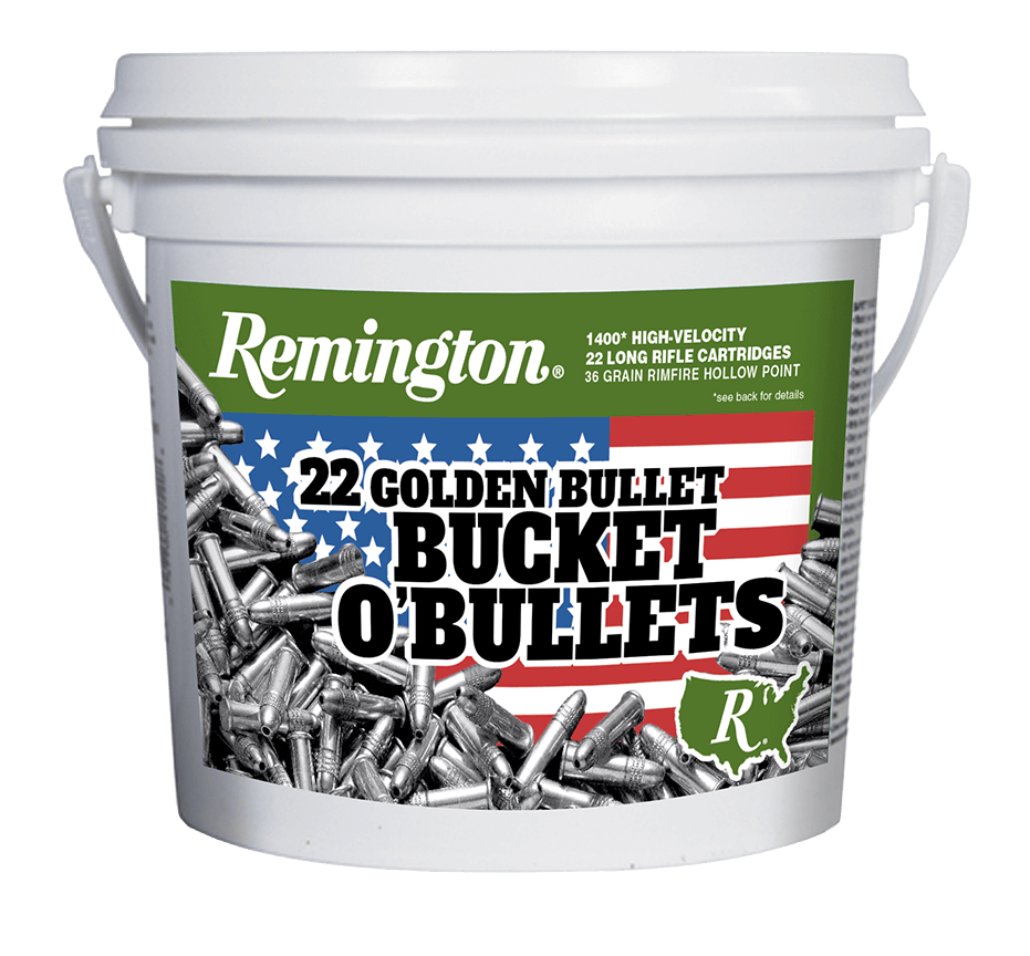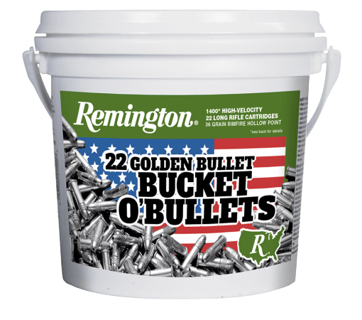 Remington 22LR Golden Bullet Bucket 36Gr Hollow Point Ammunition, 1400 rounds. This Remington Bucket O’ Bullets bulk pack is literally a bucket full of bullets! If you are having an extended range day with friends, family, or teaching classes, you will have plenty of ammunition with the Bucket Pack. Each bucket comes with Remington’s improved Golden Bullet 36 grain hollow points. Made with a higher velocity than ever before. Remington Golden Bullets come with brass cases and plated lead hollow points for reliable feeding and consistent performance. Ideal for plinking or hunting.