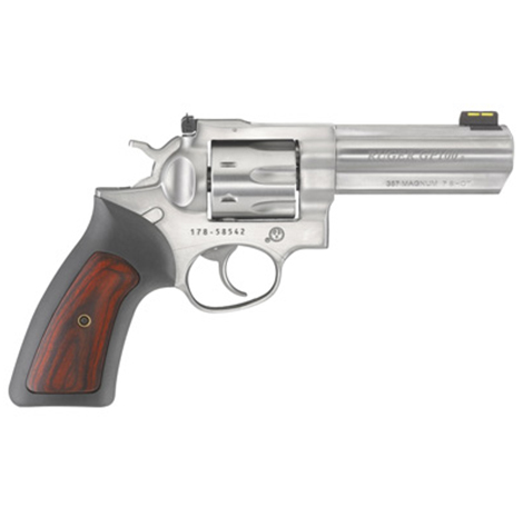 Strong and reliable shot after shot, all GP-100 revolvers have solid steel sidewalls (no side-plates), making them rugged, reliable, and dependable. This model 01771 comes chambered in .357 Magnum and comes with 7-shot cylinder and a green fiber-optic front sight.
