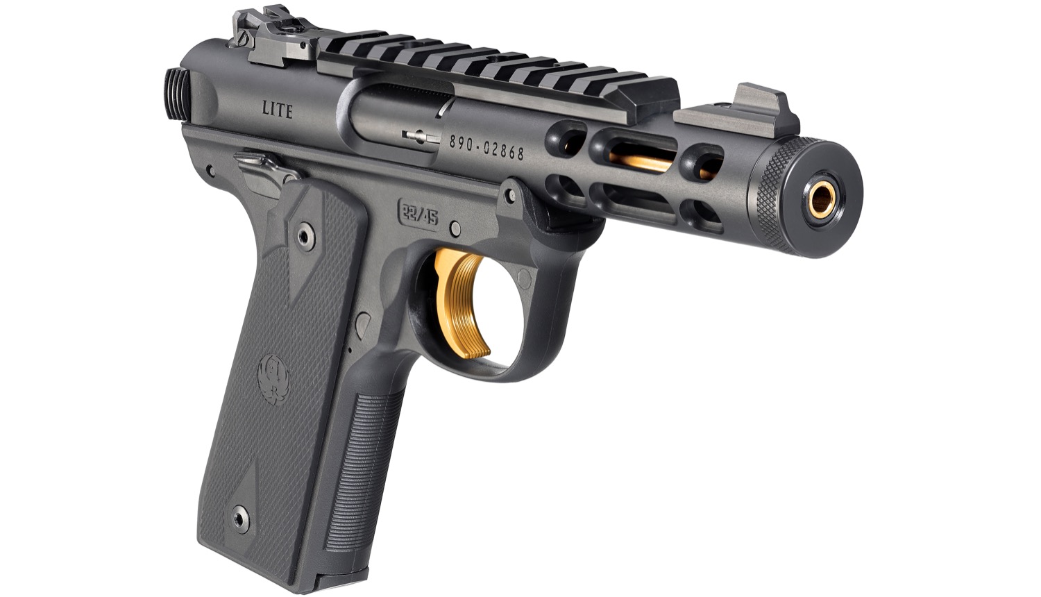 Ruger’s Mark IV features a simple, one-button takedown for quick and easy field-stripping and proper chamber to muzzle cleaning. The recessed button in the back of the frame allows the upper receiver to tilt up and off of the grip frame without the use of tools. Its internal cylindrical bolt construction ensures permanent sight to barrel alignment, while the contoured ejection port and easy-to-grasp bolt ears allow for durable and reliable operation. The accurate sighting system features a drilled and tapped receiver for Weaver- or Picatinny-style rail. The Mark IV is a single action and utilizes an ambidextrous manual safety, push-button magazine release located on the left side, and an ergonomic bolt stop. Included is a washer and two magazines. This 22/45 Lite model features an aerospace-grade aluminum, ventilated receiver with a black anodized finish. It also has a threaded 4.4″ barrel, black polymer grip frame, checkered 1911-style grip, and a fixed front sight with an adjustable rear.
