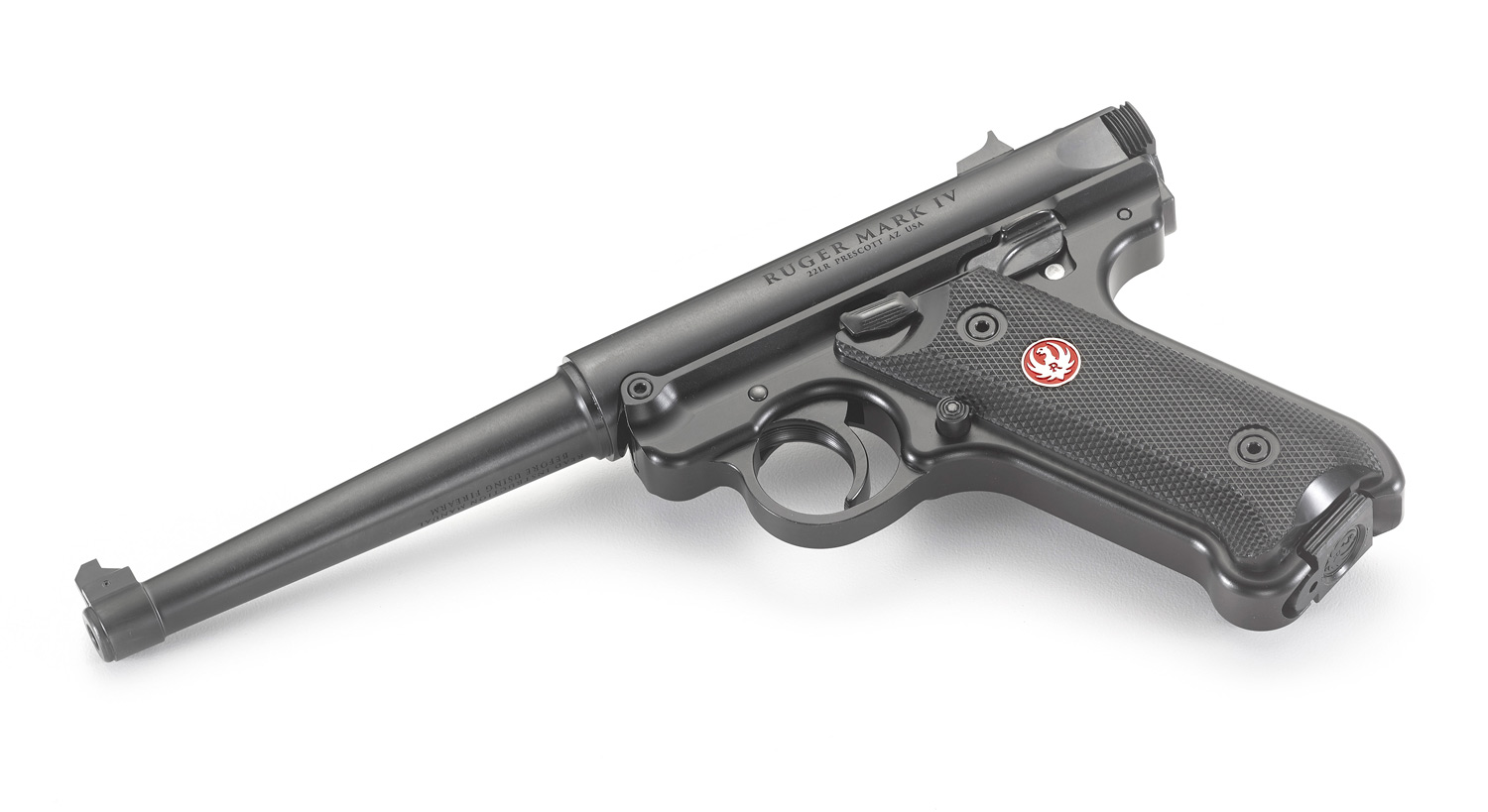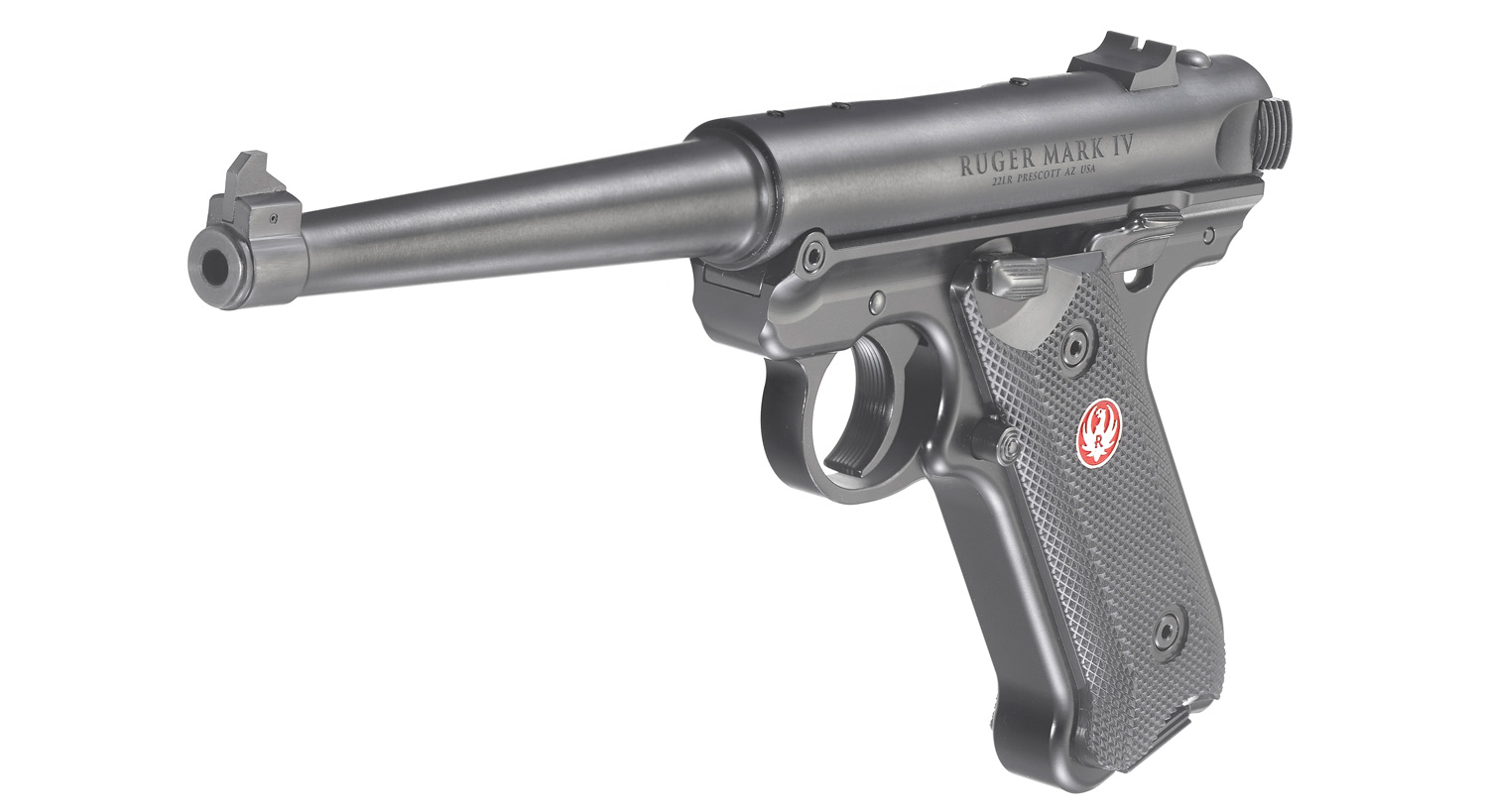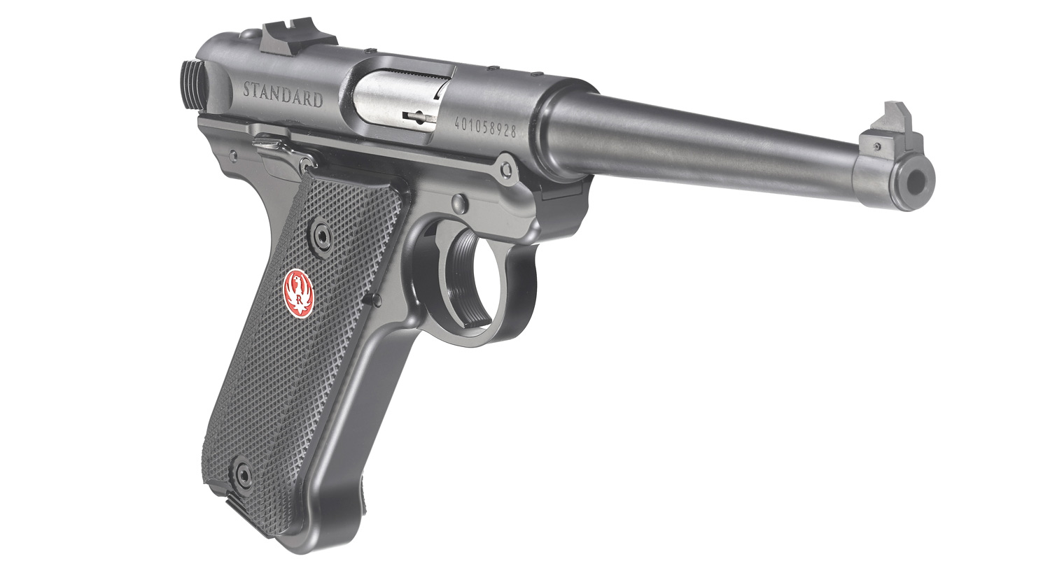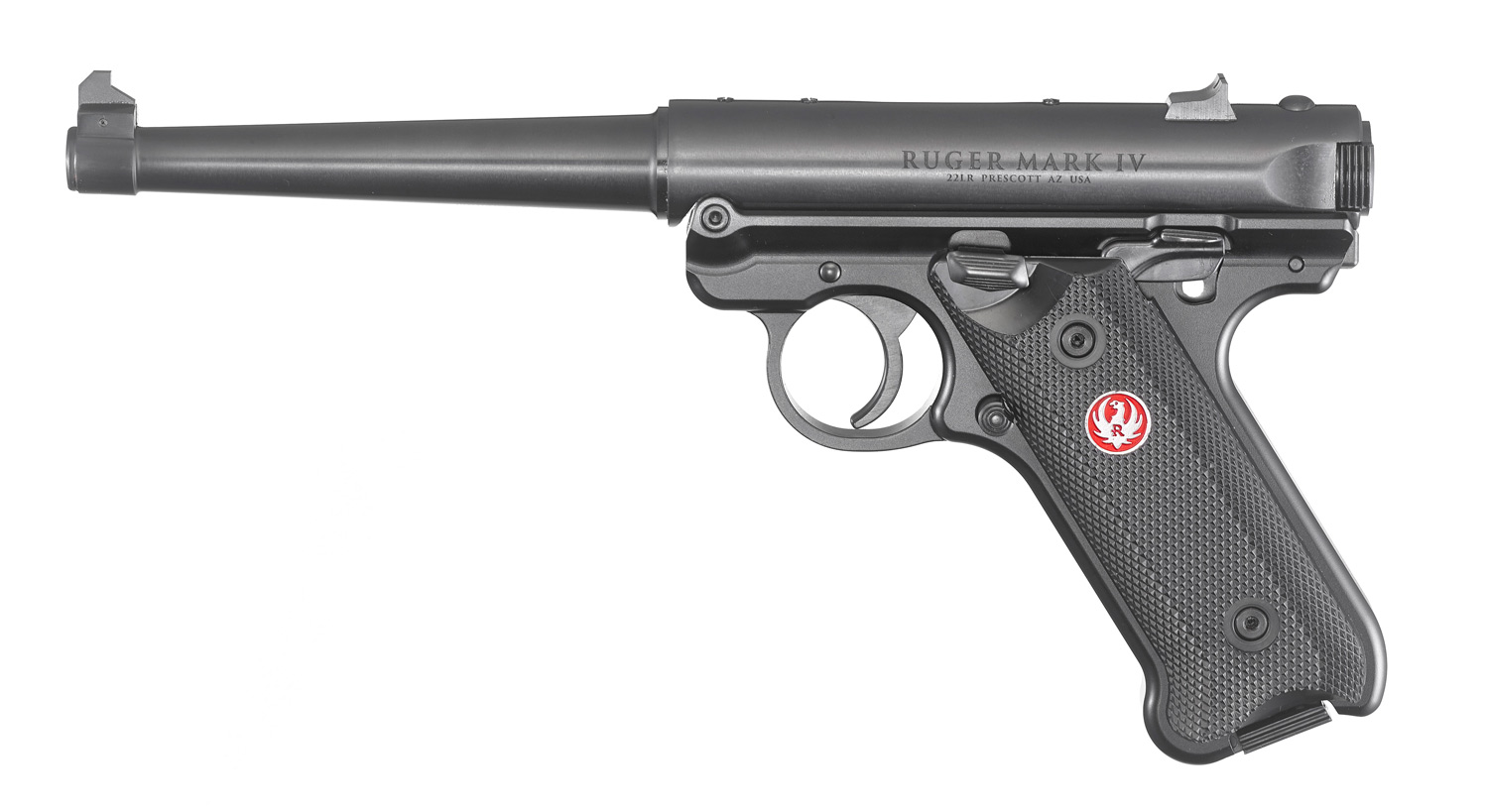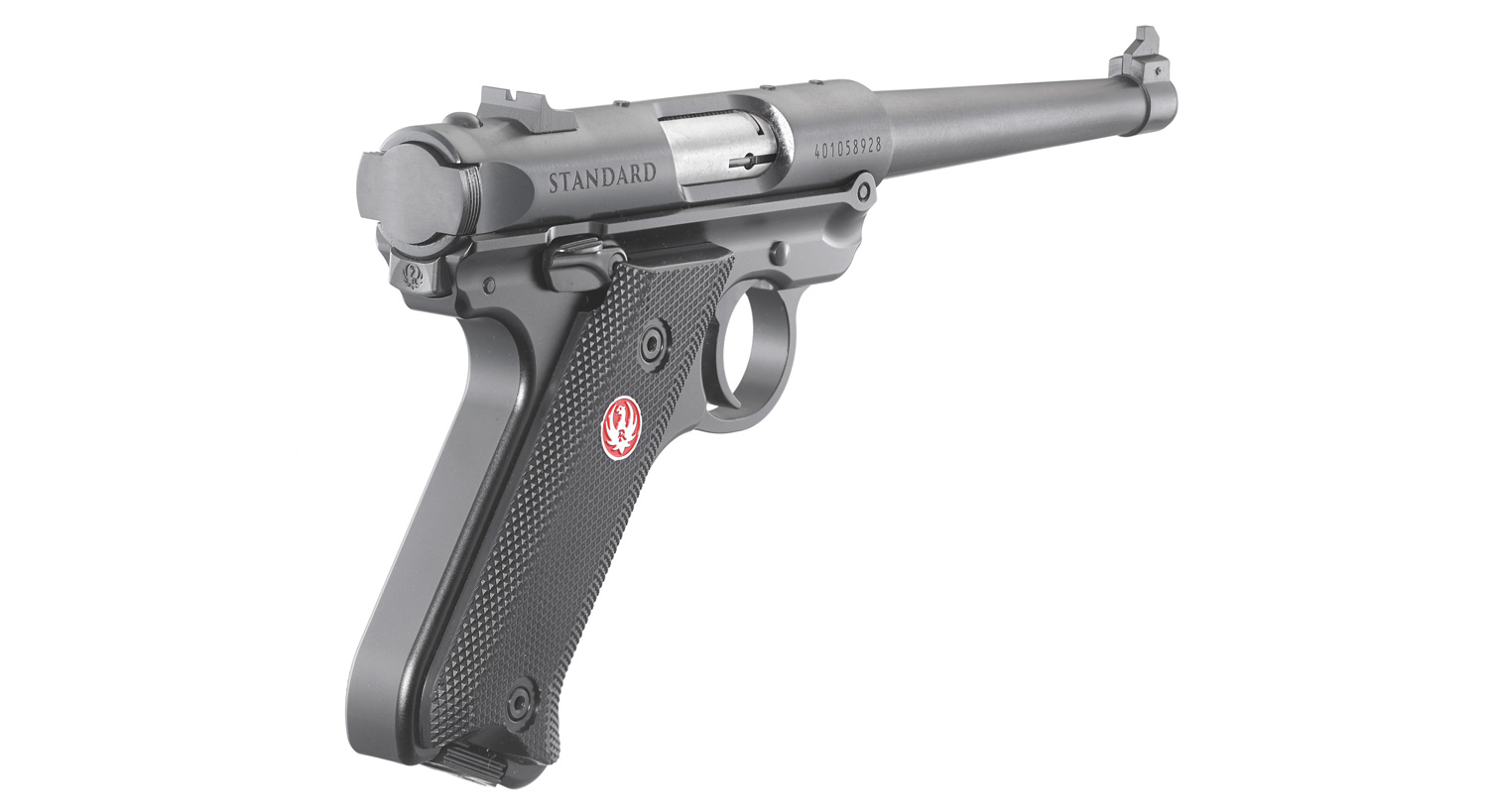 The Ruger Mark IV Standard Rimfire Pistol features a tapered barrel and a natural pointing grip angle. The Standard model is offered with a 6in. barrel length and fixed sights. It features a one-piece, precision CNC-machined grip frame. Like all pistols in the Mark IV family, Standard models feature a simple, one-button takedown for quick and easy field-stripping, ambidextrous manual safety and a redesigned bolt stop for more ergonomic operation. The magazines drop free on release for faster reloads and a redesigned magazine disconnect prevents discharge when the magazine has been removed.