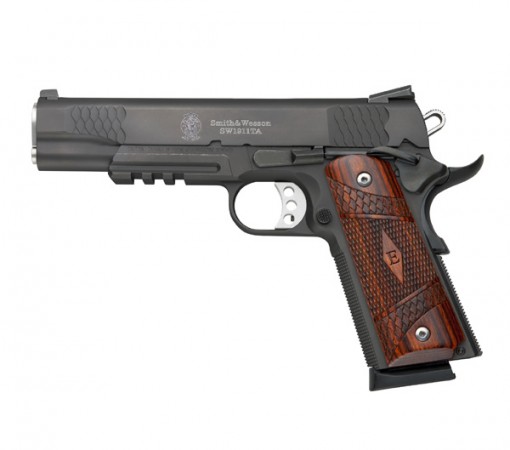 The Smith & Wesson 1911TA E-Series, 8 Round Semi Auto Handgun, .45 ACP includes many custom features to make it an excellent choice for a full size .45ACP firearm. The S&W 1911TA features fish scale serrations on the front and rear of the slide, a tactical accessory rial, and wood laminate E-Series grips. The 5″ stainless steel barrel and Tritium Night Sights allow for maximum accuracy of this Smith & Wesson 1911 E-Series pistol. The 1911TA also sports both a grip and thumb safety for extra security. All Smith & Wesson 1911 E-Series firearms are backed by their S&W Lifetime Service Policy.