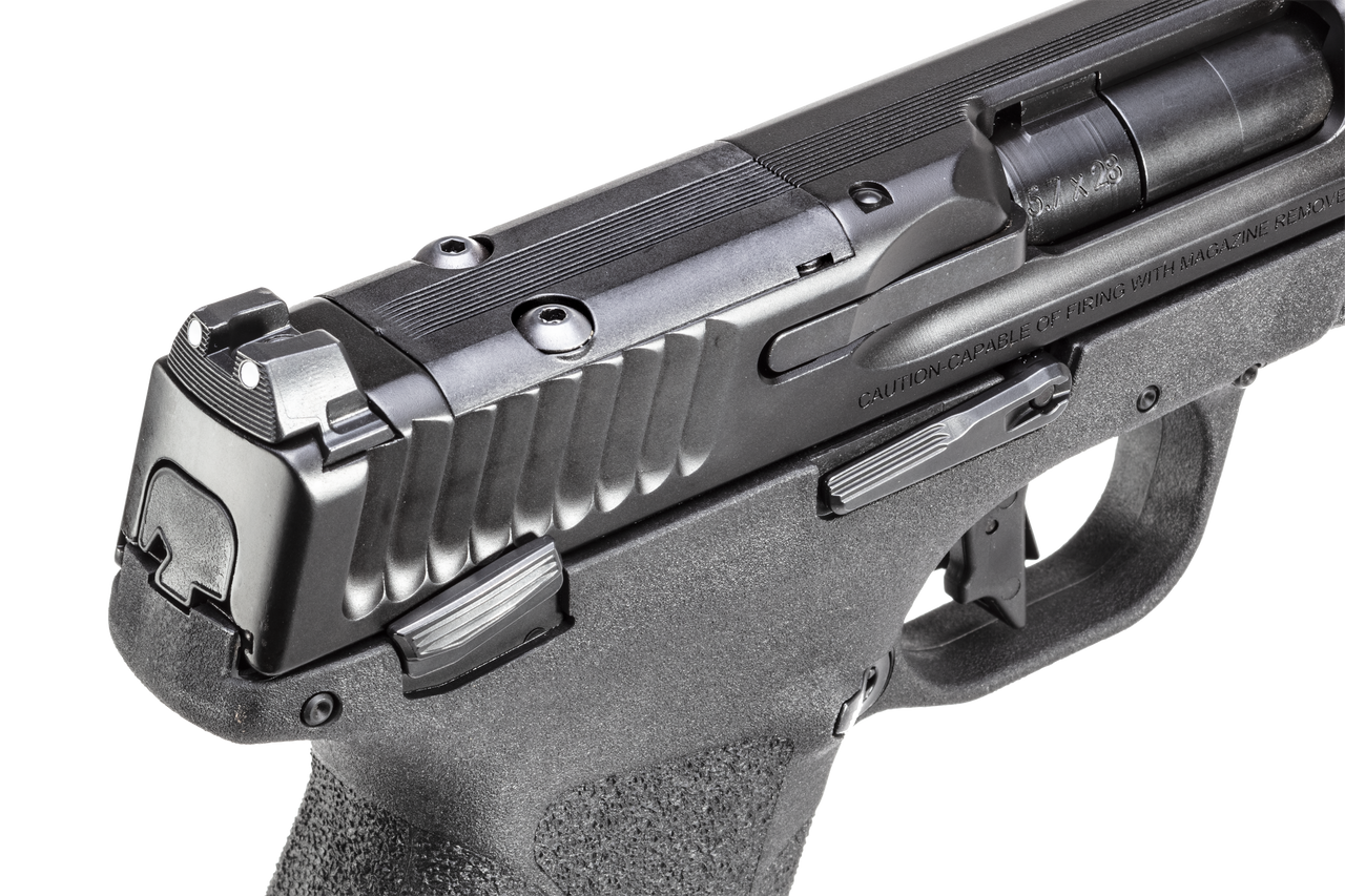 With a staggering 22+1 capacity, the M&P5.7 introduces a new and innovative technology – the Tempo Barrel System. Using the ballistics of the 5.7x28mm round, the rotating 5″ Tempo Barrel gives you the repeatability you need to take control and feel the fast.