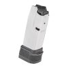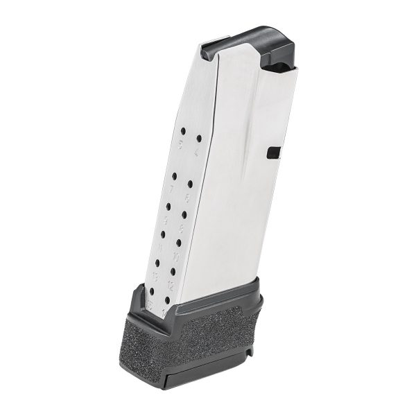 The 15-round magazine for the Hellcat features stainless steel construction for durability, numbered round count witness holes and a polymer follower. The magazine’s extension gives you extra gripping area and has a pattern that matches the Adaptive Grip Texture of the Hellcat’s frame. The 15-Round magazine measures only .28″ taller than the 13-round extended magazine.