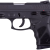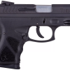 The Taurus TH9 Compact 9MM Pistol series features hammer-fired, SA/DA with a manual safety and an ergonomic, textured polymer grip/frame with an integrated accessory rail. The matte black carbon steel slide has front and rear drift adjustable Novak sights. The compact TH pistol has a 3.54″ slide for a 6.85″ OAL. This TH9c model has a black frame finish and includes one 13-round and one 17-round magazine.