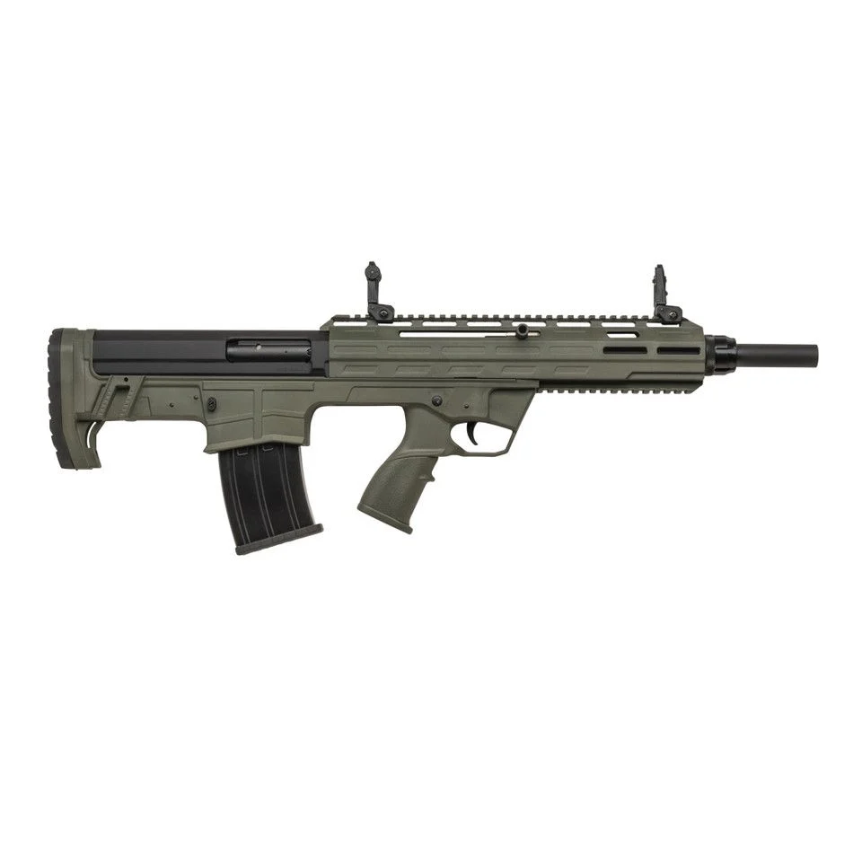 A rugged ODG finish on a bullpup chassis keeps overall length minimal without sacrificing magazine capacity. Semi-automatic action with a 5-round detachable mag and low-profile flip-up sights provides fast follow-up shots and clear sight picture in a compact package — ideal for range use or close-quarters applications. Clean, modern styling and durable components make it easy to carry, aim, and operate.