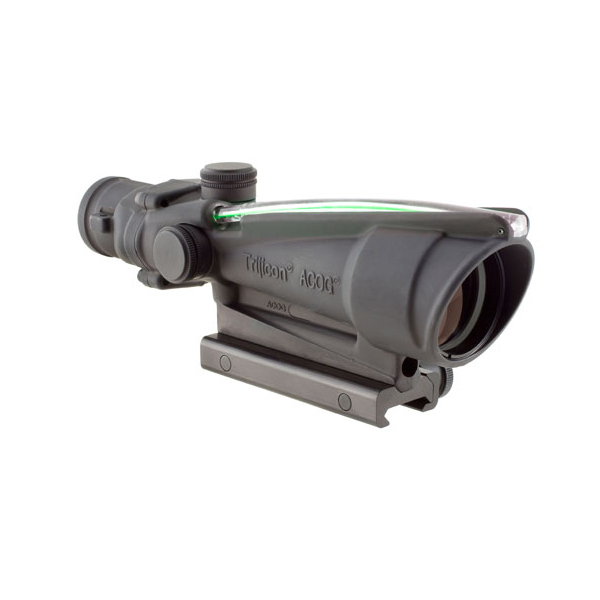 Trijicon TA11H-G : ACOG 3.5×35 scope with Green Horseshoe BAC Reticle and Target Reference System—the ranging reticle is calibrated for 5.56 (.223 cal) flat-top rifles to 1000 meters. Includes Flat Top Adapter. Daytime illumination is provided by fiber optics and Tritium illuminates the scopes at night.
