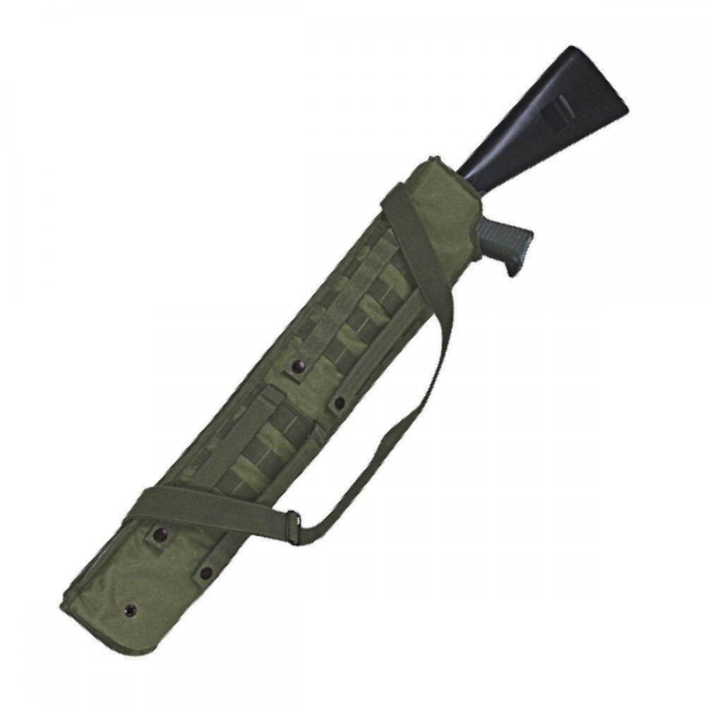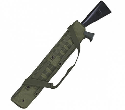 Voodoo Tactical Shotgun Scabbard Olive W/ Attached Machete Sheath 20-0073 – We’ve added some back up to our shotgun scabbard in the form of an attached 18” machete sheath. This MOLLE compatible shotgun scabbard is designed to give you a safe, convenient way to transport your shotgun by strapping it to your backpack, rucksack, or padded weapons case. It can also be slung across your back with the adjustable, removable nylon web sling, allowing you to draw it quickly when needed. A clever person will undoubtedly find many other suitable locations where the scabbard can useful to protect your shotgun from dirt, sand and weather while allowing quick and easy access.