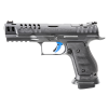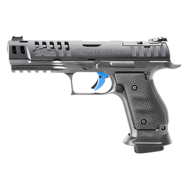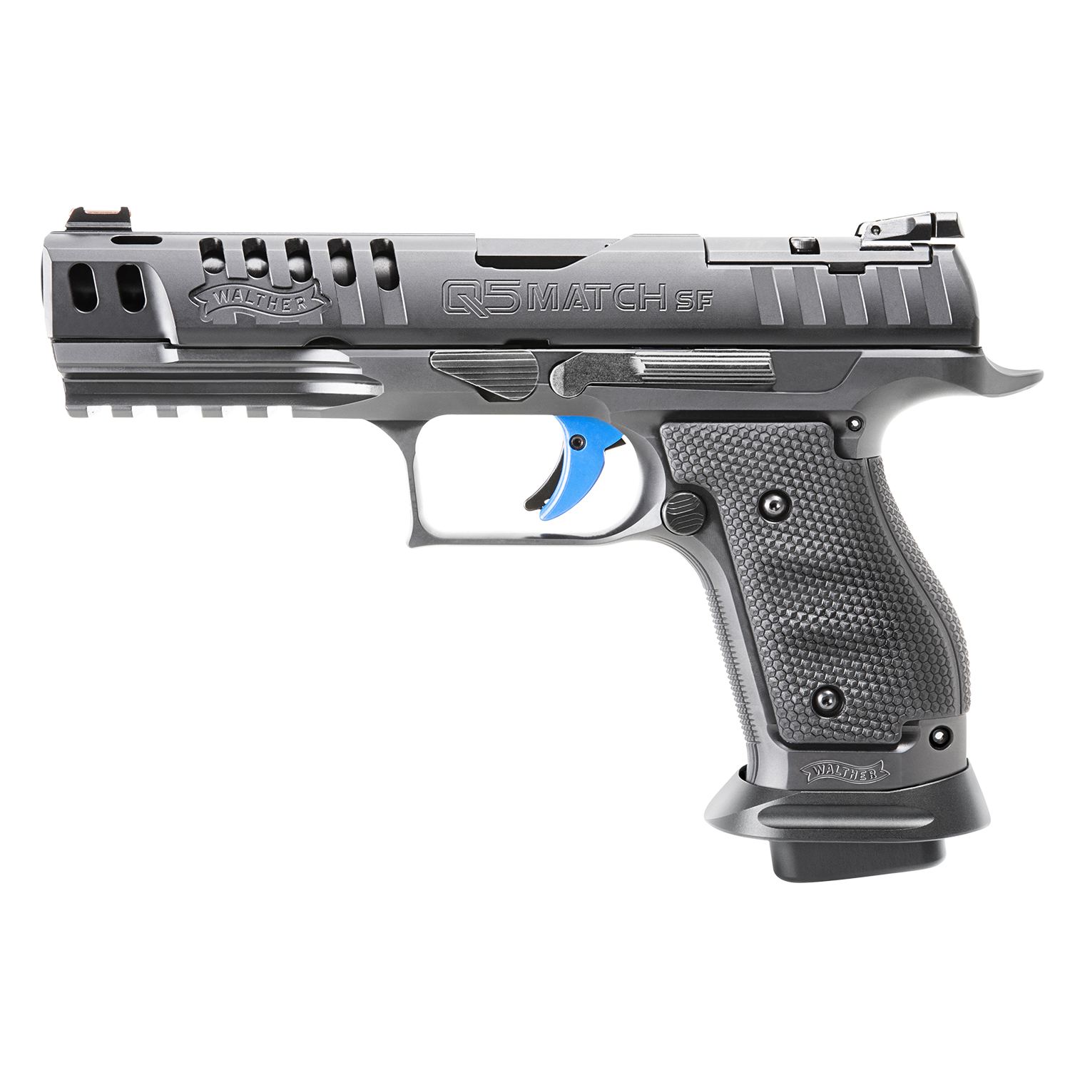 Say hello to the Walther Q5 Match Steel Frame Pro 9×19! A 9MM pistol capable of holding 17 rounds in its detachable magazine, this Walther handgun is built for the production class competitive shooter. Built around our award winning PPQ platform, the Q5 Match features an optics ready slide that comes with a Trijicon RMR, Leupold Delta Point, and Docter Optics ready mounting plate in addition to the standard competition iron sights already included. Coupled with a ported slide, Carl Walther signature ergonomics, and a blue quick defense trigger. Q5 is the firearm that gives you match performance in a production class firearm. The textured ergonomic grip has finger grooves, while the slide stop features ambidextrous controls. The Q5 Match is built with a metal fiber-optic front sight – the metal target rear sight is adjustable for windage and elevation. With a 5″ barrel and light 5.6 lb trigger pull and comes with 3 magazines. The Walther Q5 is the firearm that gives you match performance in a production class firearm.  WALTHER ARMS LEGENDARY LIMITED LIFETIME WARRANTY